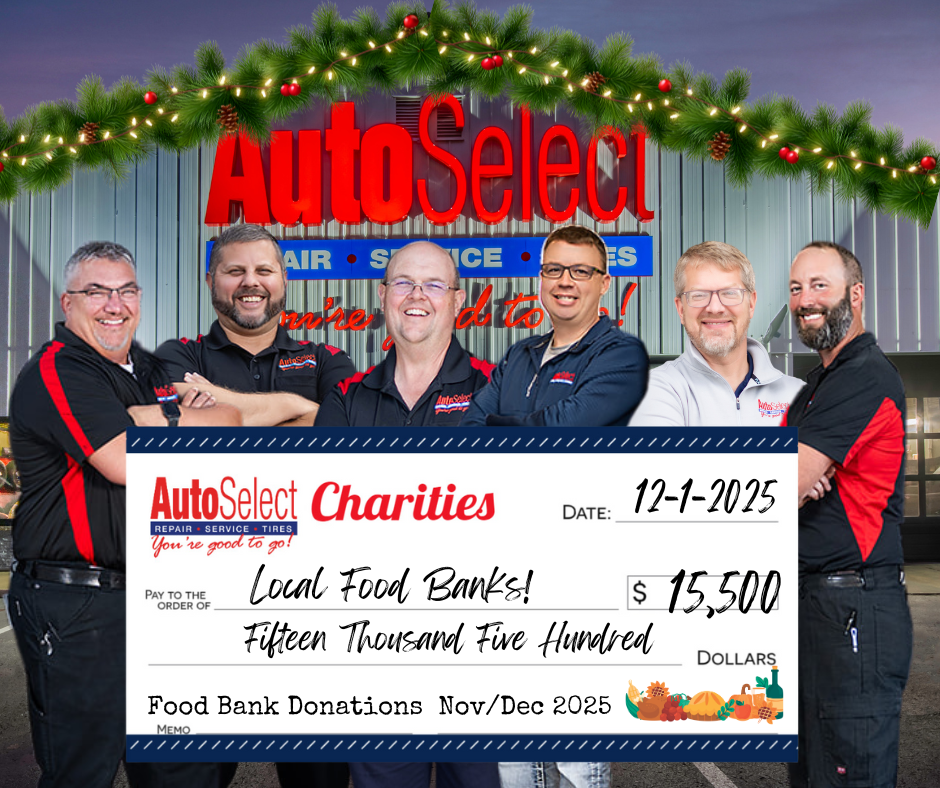 As we mark Auto Select’s 25th anniversary, we’re proud to celebrate something that has always been at the heart of our business: giving back. For a quarter of a century, our team has believed that auto repair goes far beyond fixing cars—it’s about supporting the people who drive them and strengthening the communities we’re fortunate to be part of. This Holiday season, we donated $15,500 to local food banks to help support our communities.