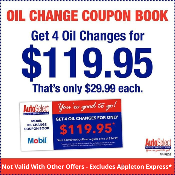 - Oil Change Coupon Club: For maximum savings, try our Oil Change Coupon Book. With the Book, you can pre-purchase 4 standard oil changes for only $119.95**. That's only $29.99 each, which is $10 off every oil change, and you can use these on any vehicle in your household. Ready to purchase? Email us today, or stop in at any of Auto Select's 11 locations.